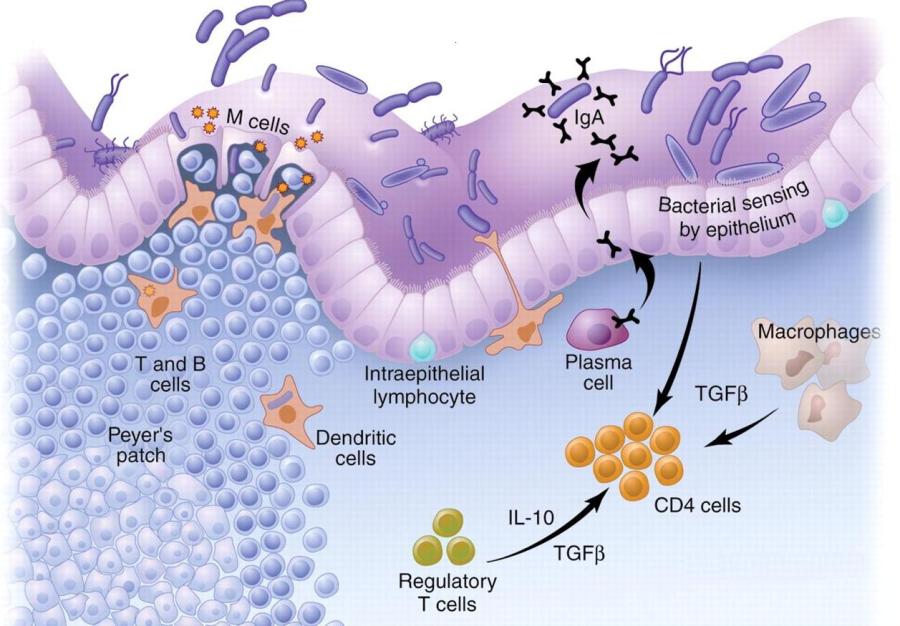 L’intestino di un individuo sano è popolato in larga parte da differenti ceppi batterici definiti commensali (lattobacilli e bifidobatteri ecc). Questi, formano la flora batterica intestinale, che influenza: il metabolismo di certi nutrienti, la produzione di alcuni neurotrasmettitori (serotonina ecc.) e l’attività e l’espressione di agenti coinvolti nella risposta immunitaria (citochine, linfociti, cellule dendritiche, agenti pro/anti-infiammatori ecc.).(Figura 1).