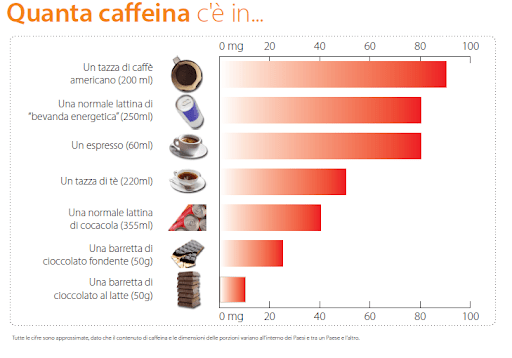 Si evidenzia inoltre che la caffeina è presente in molti altri alimenti oltre che al caffè come ad esempio il cioccolato, il Tè, le bevande energetiche