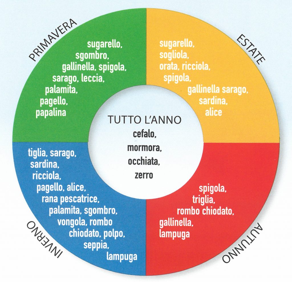 - Alice, calamaretto, calamaro, cefalo, dentice, gattuccio, mazzancolla, moscardino, nasello, pagro, pannocchia, polpo, rombo, sarago, sardina, seppia, sgombro, sogliola, spigola, spinarolo, tonno rosso, triglia, vongola verace.