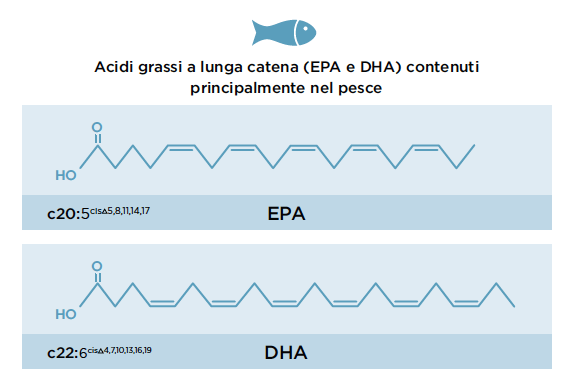 In particolare, è stato dimostrato il ruolo protettivo dell’acido eicosapentaeoico (EPA, C20:5 n-3) e dell’acido docosaesaenoico (DHA, C22:6 n-3) per ridurre le patologie cardiache. Tale effetto benefico è stato attribuito ad una riduzione del rapporto n-6/n-3 nei lipidi ematici dell’uomo ed a livello delle membrane cellulari ed è per tale motivo che il consumo di pesci che presentano un elevato rapporto di questi acidi, come ad esempio il pesce azzurro di piccola taglia, il merluzzo, il salmone, lo sgombro, viene considerato da tempo benefico per la salute umana.