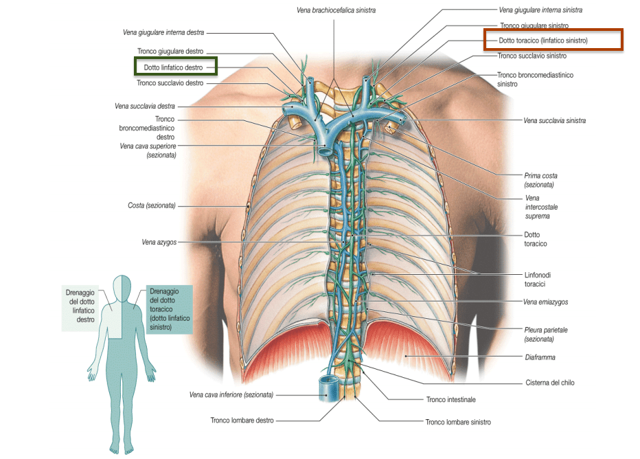 Il primo è il Dotto toracico: raccoglie tutta la linfa proveniente dalle gambe, dall’assorbimento intestinale (regione sottodiaframmatica) e dal polmone sinistro e braccio sinistro e si riversa nella vena suclavia sinistra;