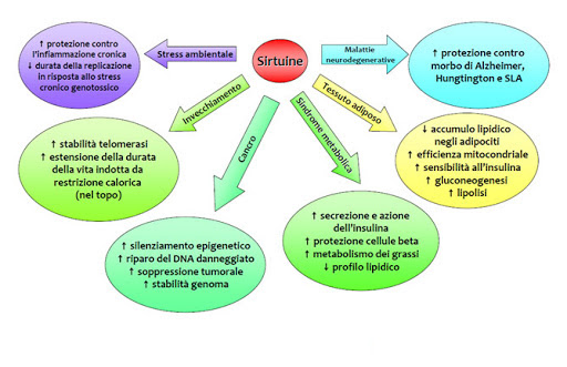 Le sirtuine sono enzimi che normalmente si attivano con la restrizione calorica. Sono implicate in fenomeni che influenzano l’invecchiamento, la regolazione della trascrizione, l’apoptosi, la resistenza allo stress (Figura 2).